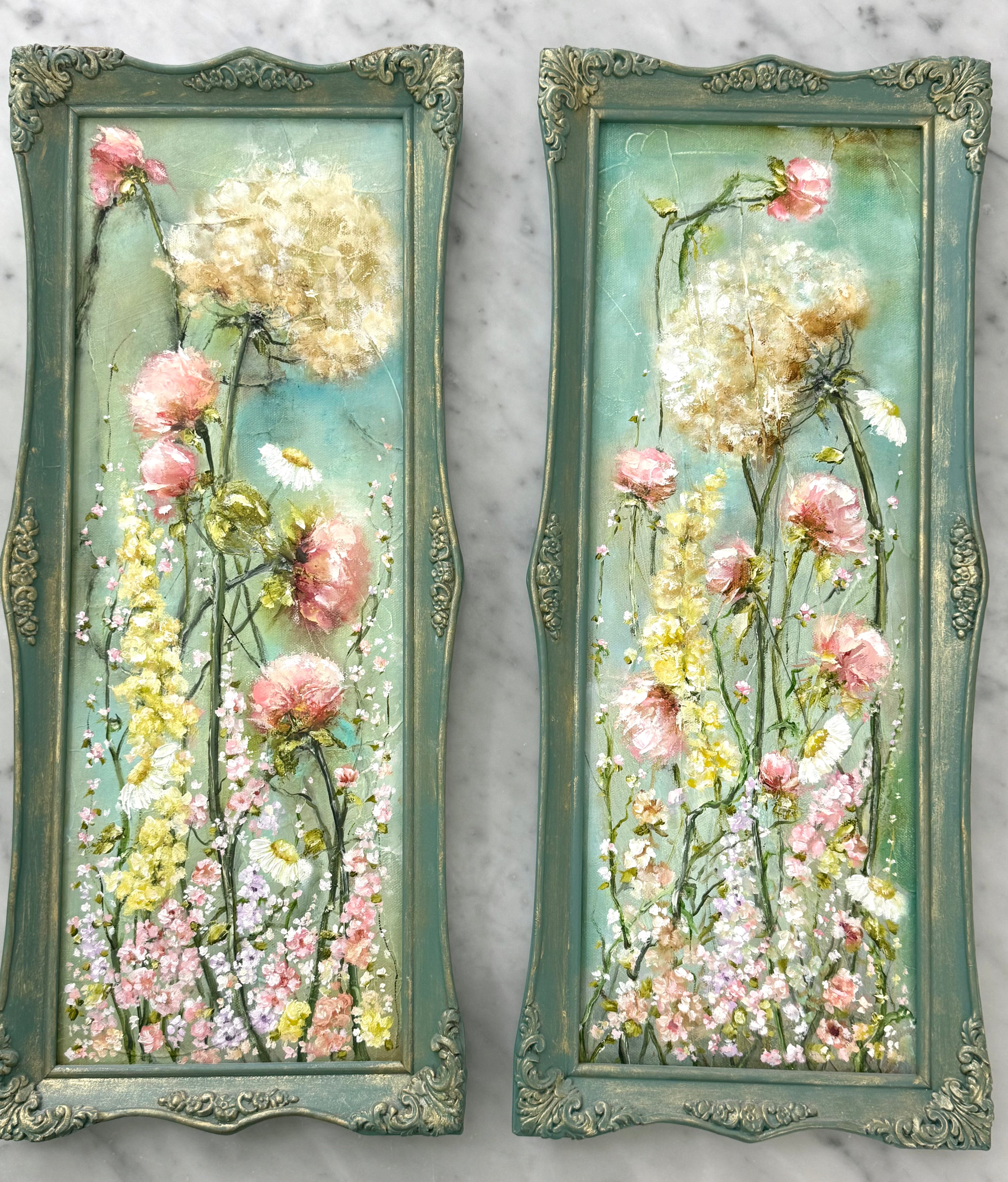 I painted this beautiful oil painting of hydrangeas and wild flowers for this vintage frame I found in the mountains. Then I painted the frame green with touches of gold. Frame measures 24" long and approximately 10" wide.