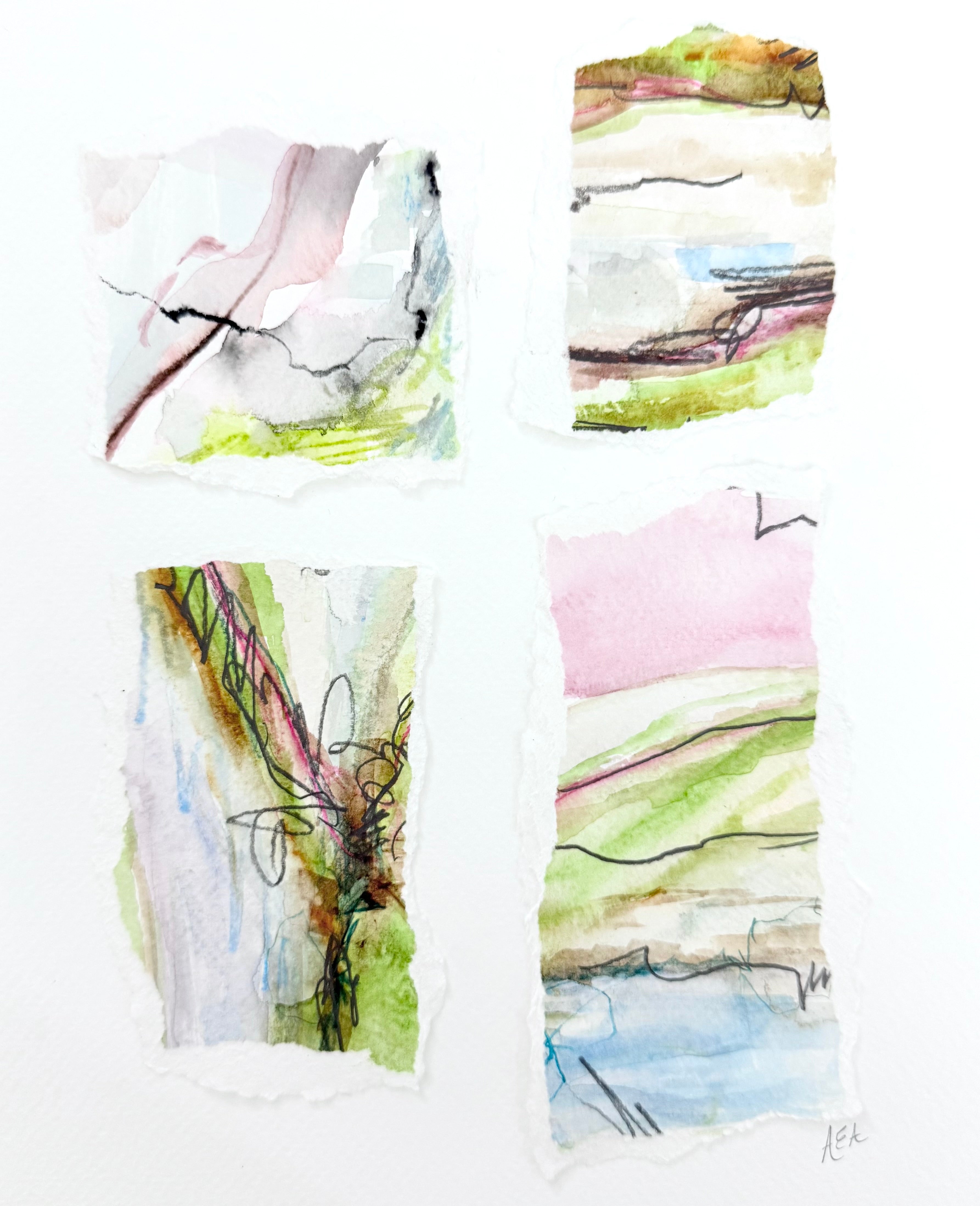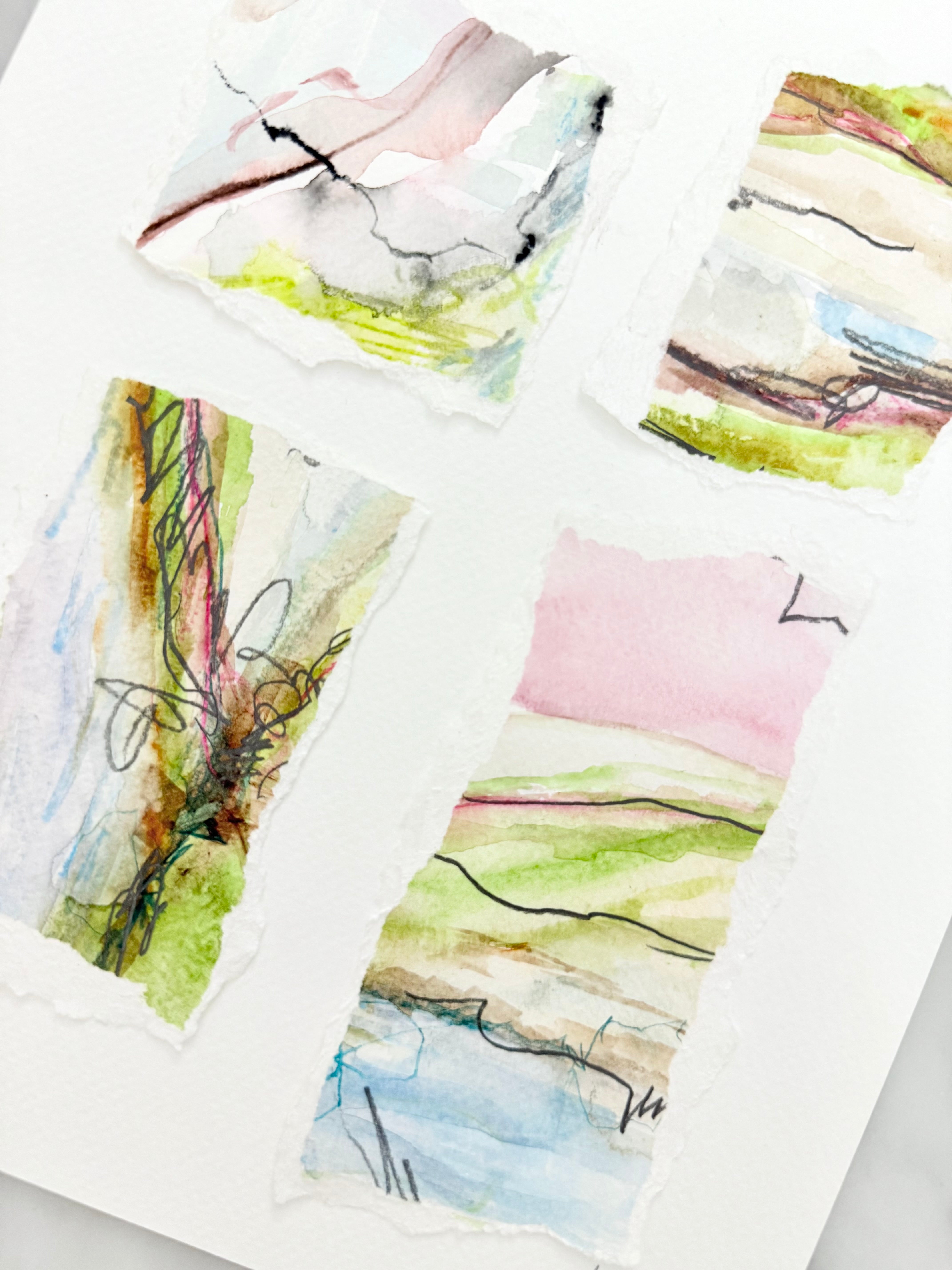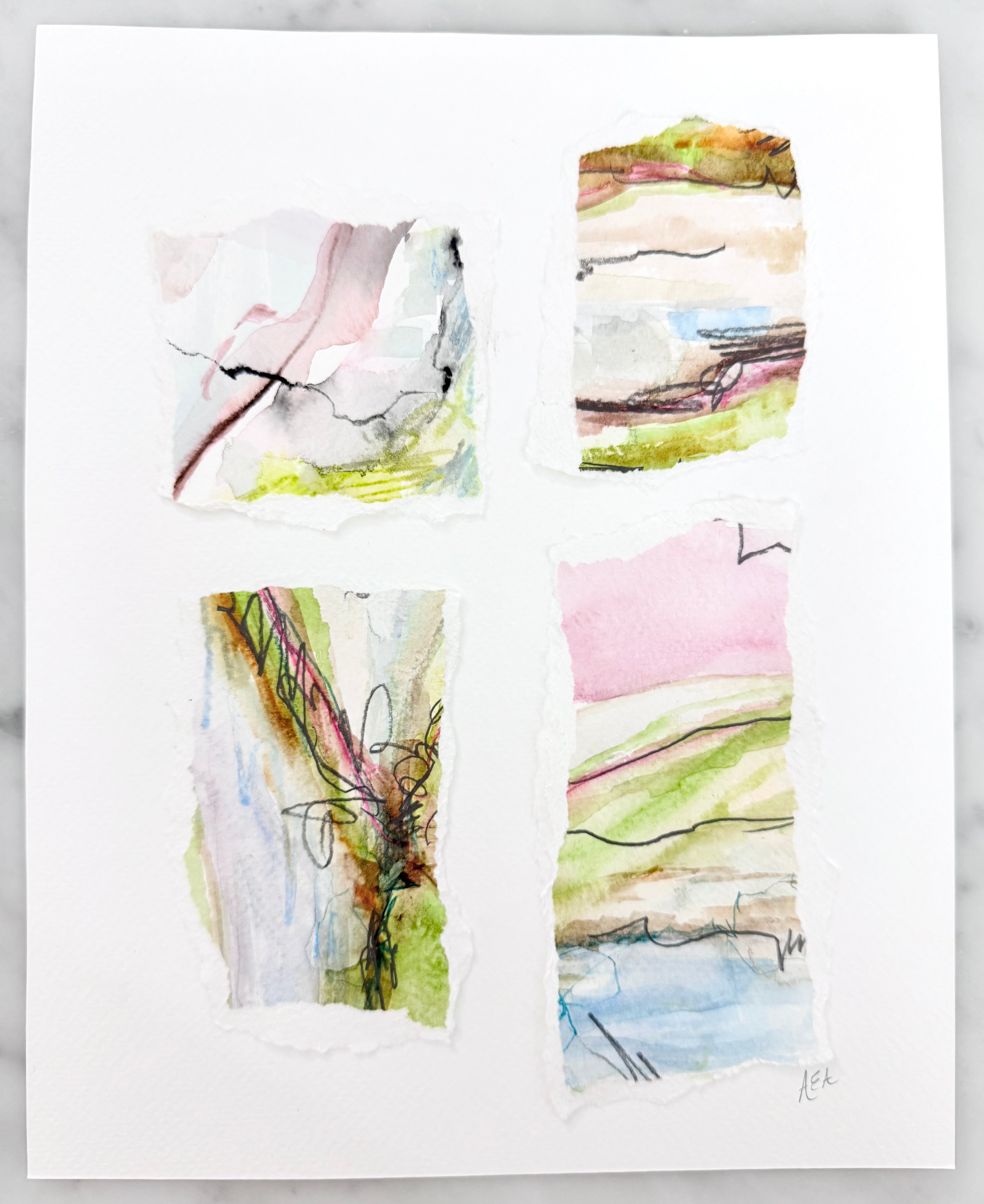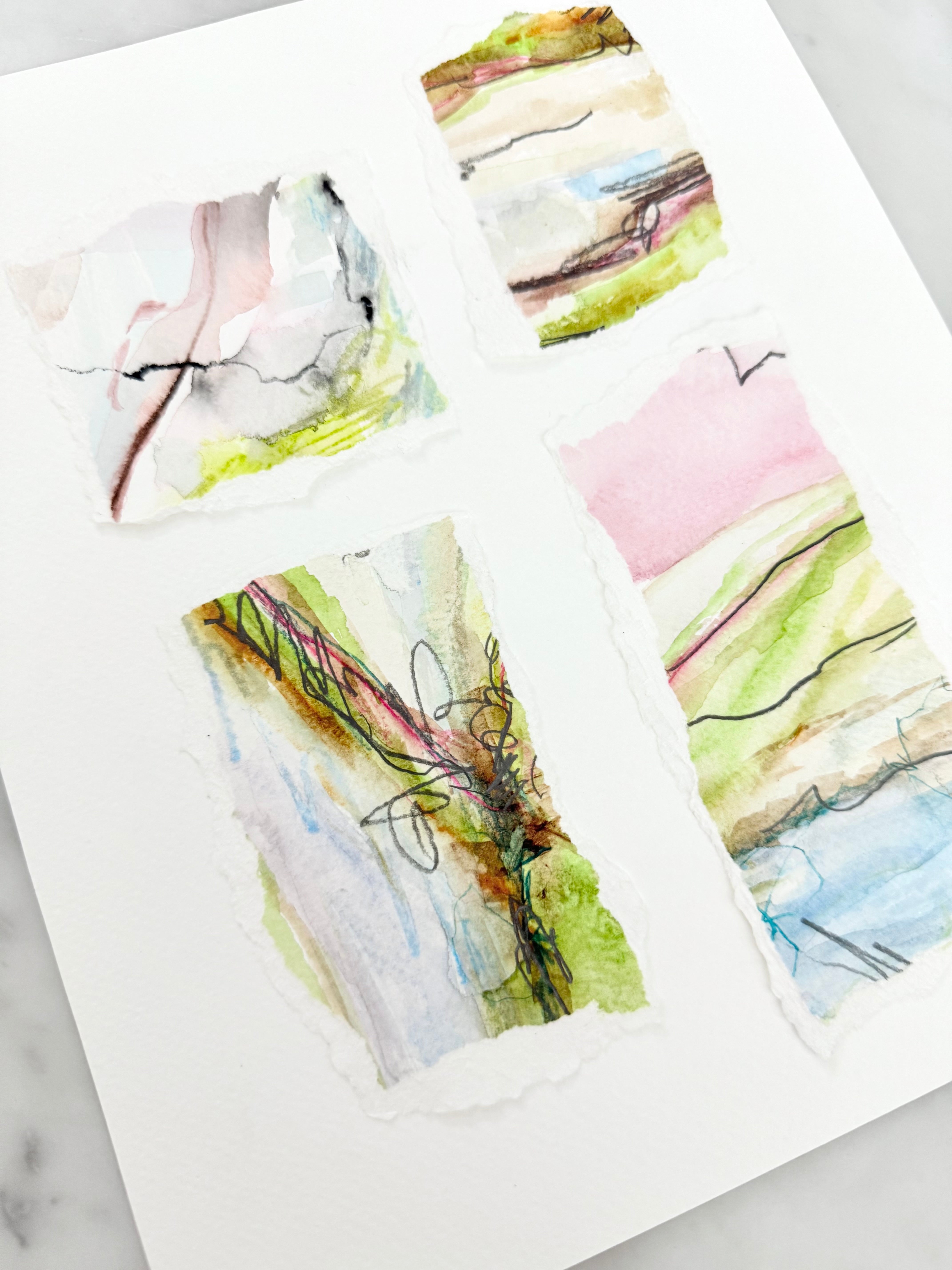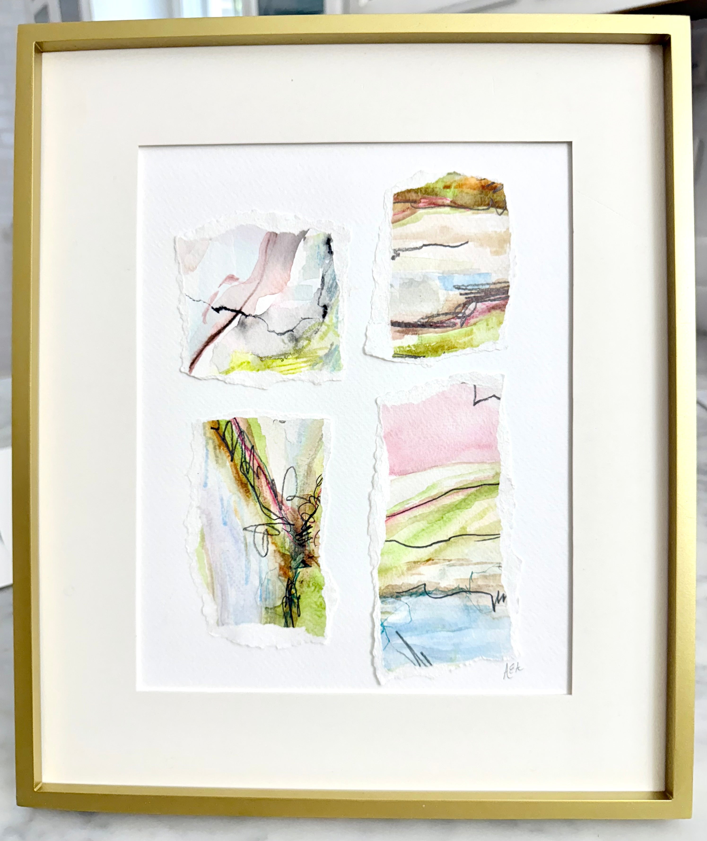 I had the most wonderful time creating these pieces.  I started with an abstract watercolor using specific color schemes. Once the painting is finished I tear it into colorful pieces and thoughtfully adhere them to a thick weighted paper. These can be framed so easily and will elevate any room.