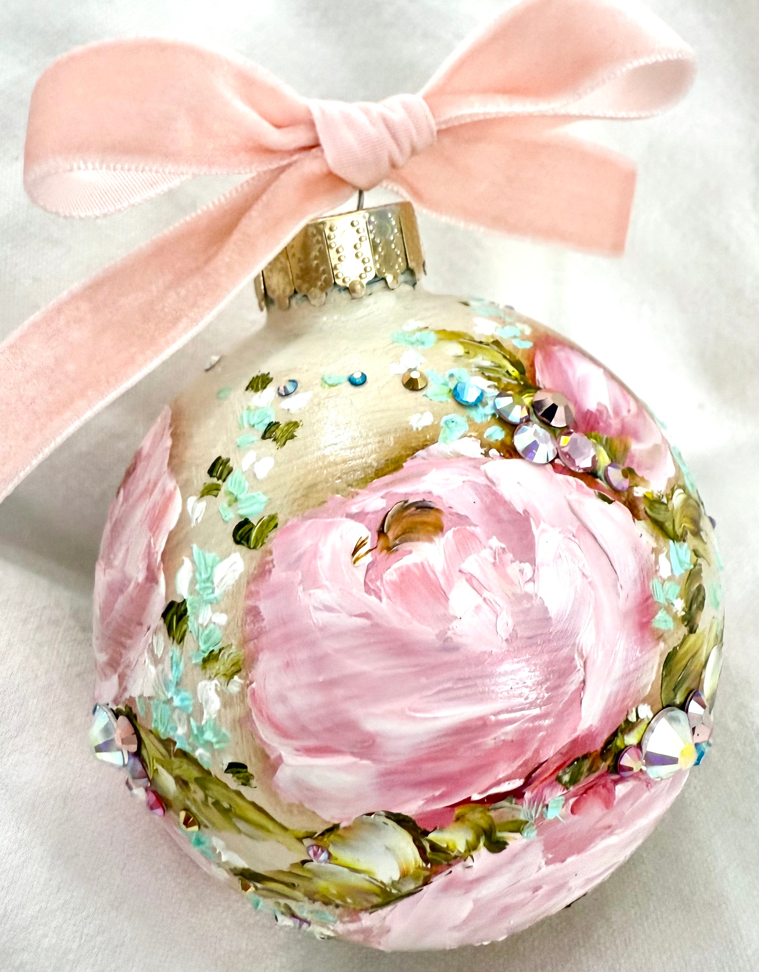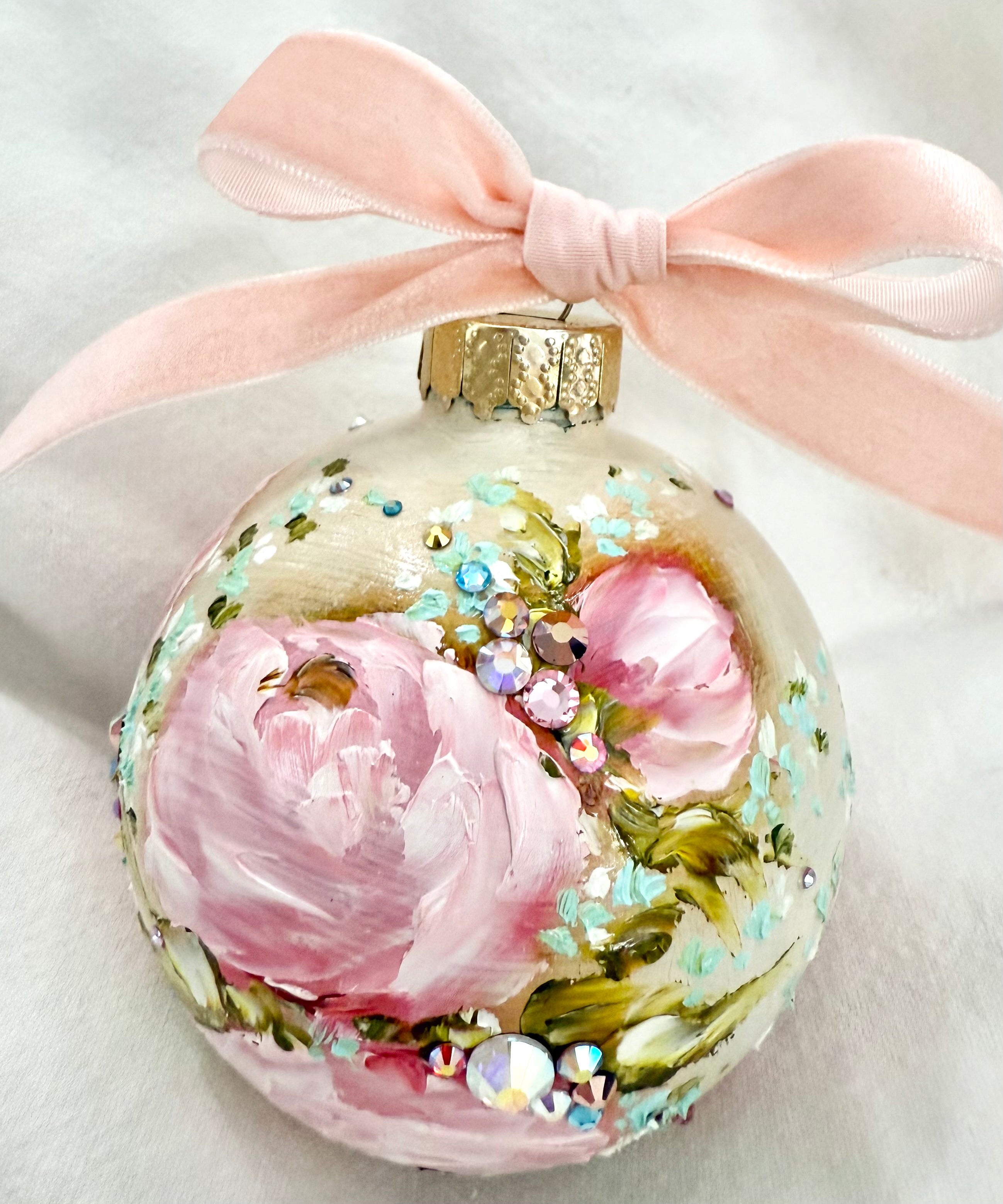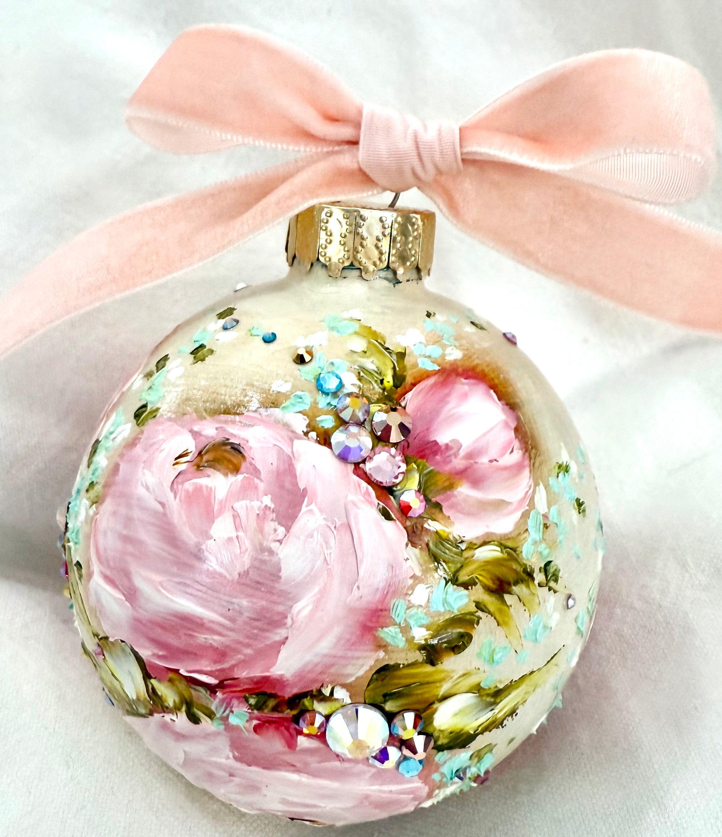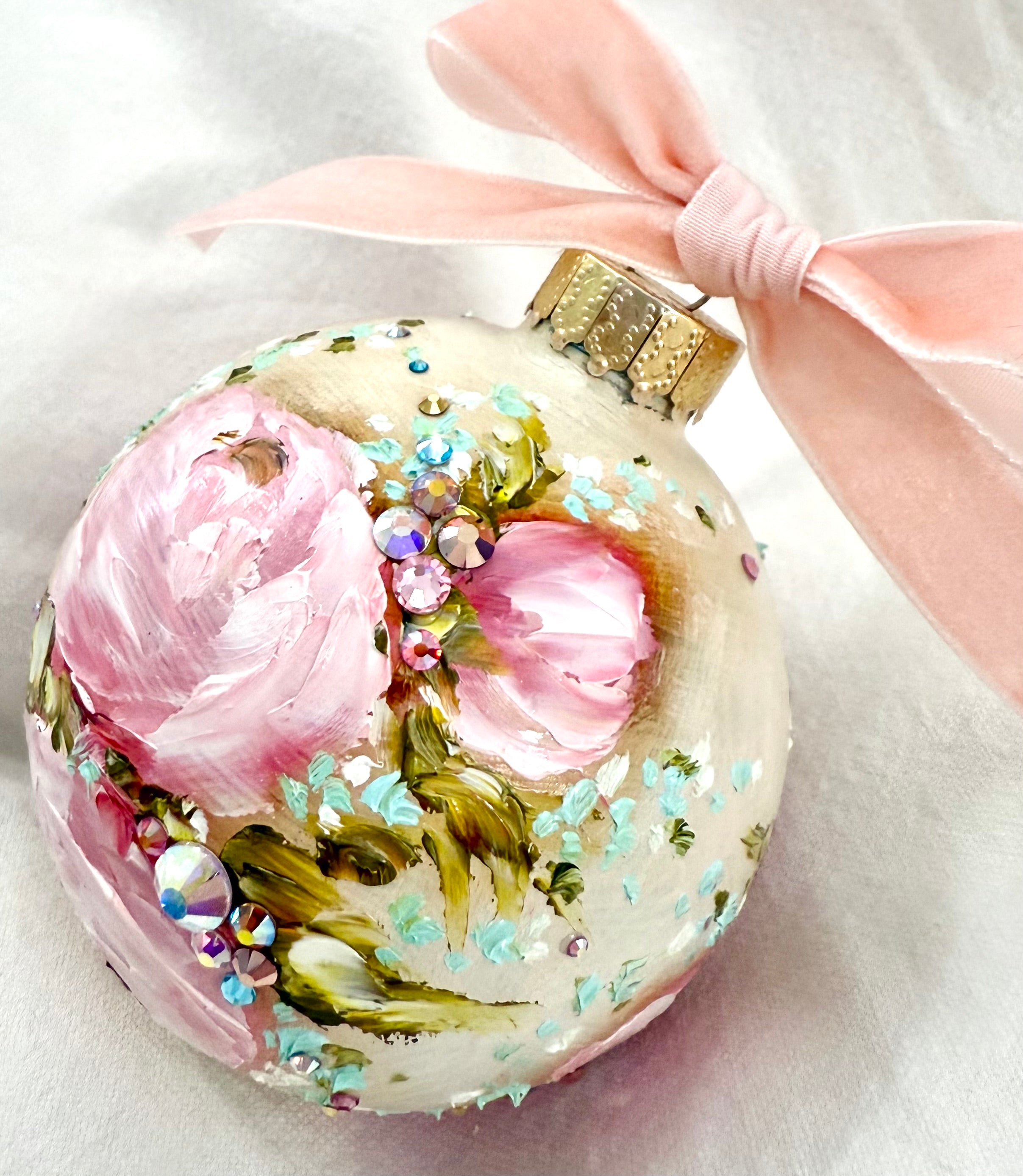 Light Beige 3" glass ornament covered in pink roses and sparkly crystals.  I hand paint all my ornaments using the finest quality oil paints and then I varnish them for protection. For the perfect finishing touch, I add sparkly crystals and my initials. These are so beautiful and make the perfect gift or addition to your Christmas tree.