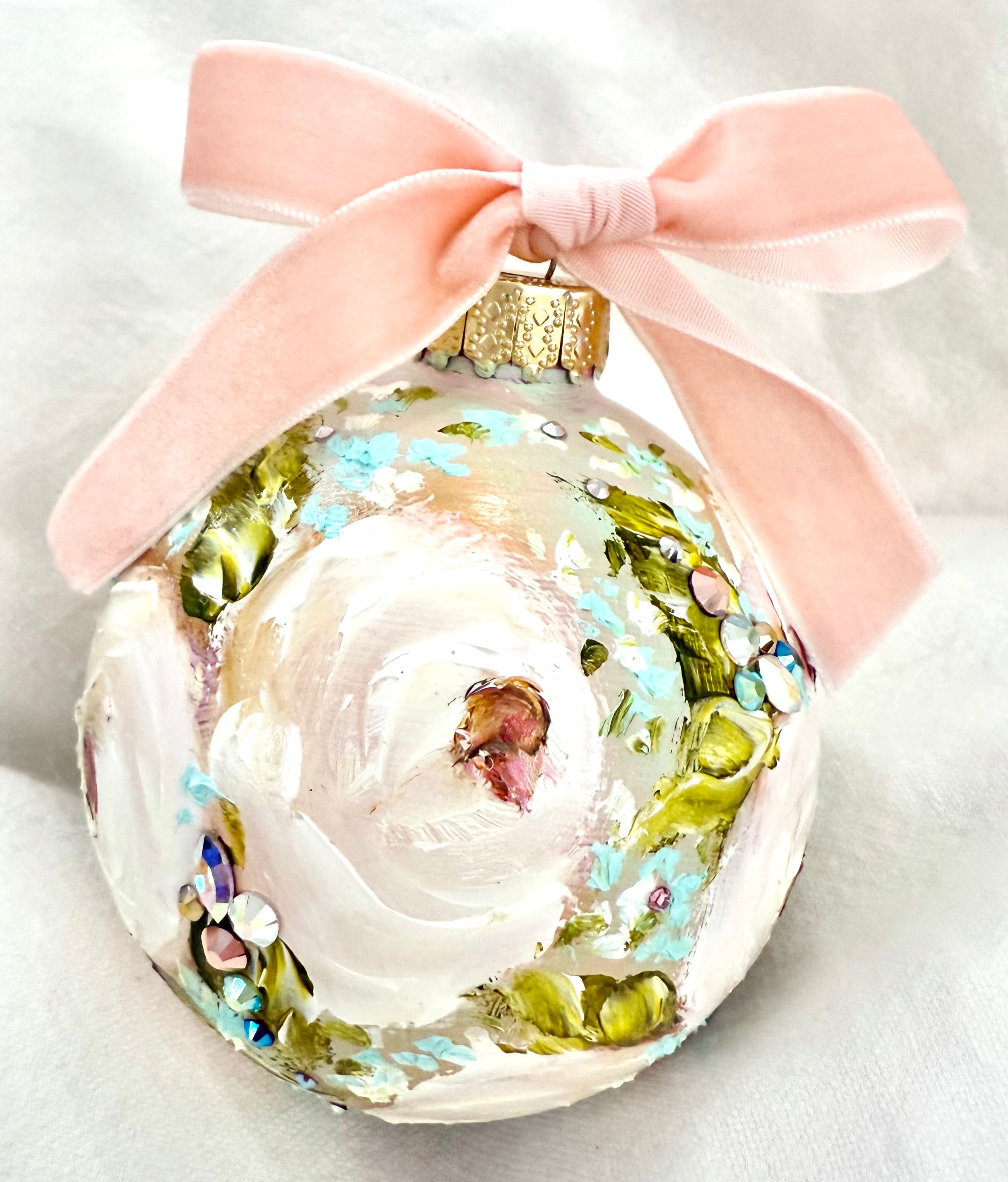 Mint green 3" glass ornament covered in white roses and sparkly crystals. I hand paint all my ornaments using the finest quality oil paints and then I varnish them for protection. For the perfect finishing touch, I add sparkly crystals and my initials. These are so beautiful and make the perfect gift or addition to your Christmas tree.