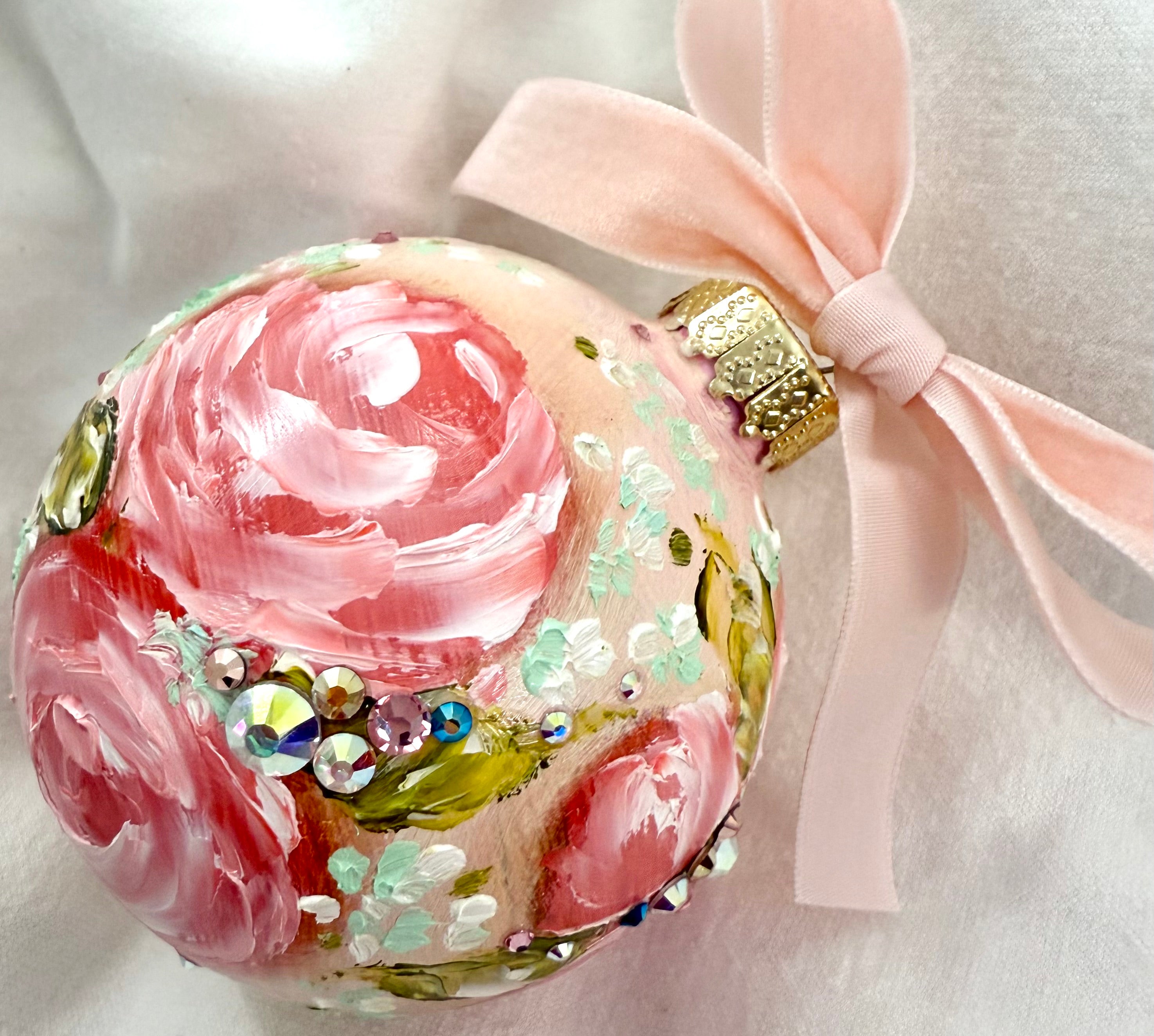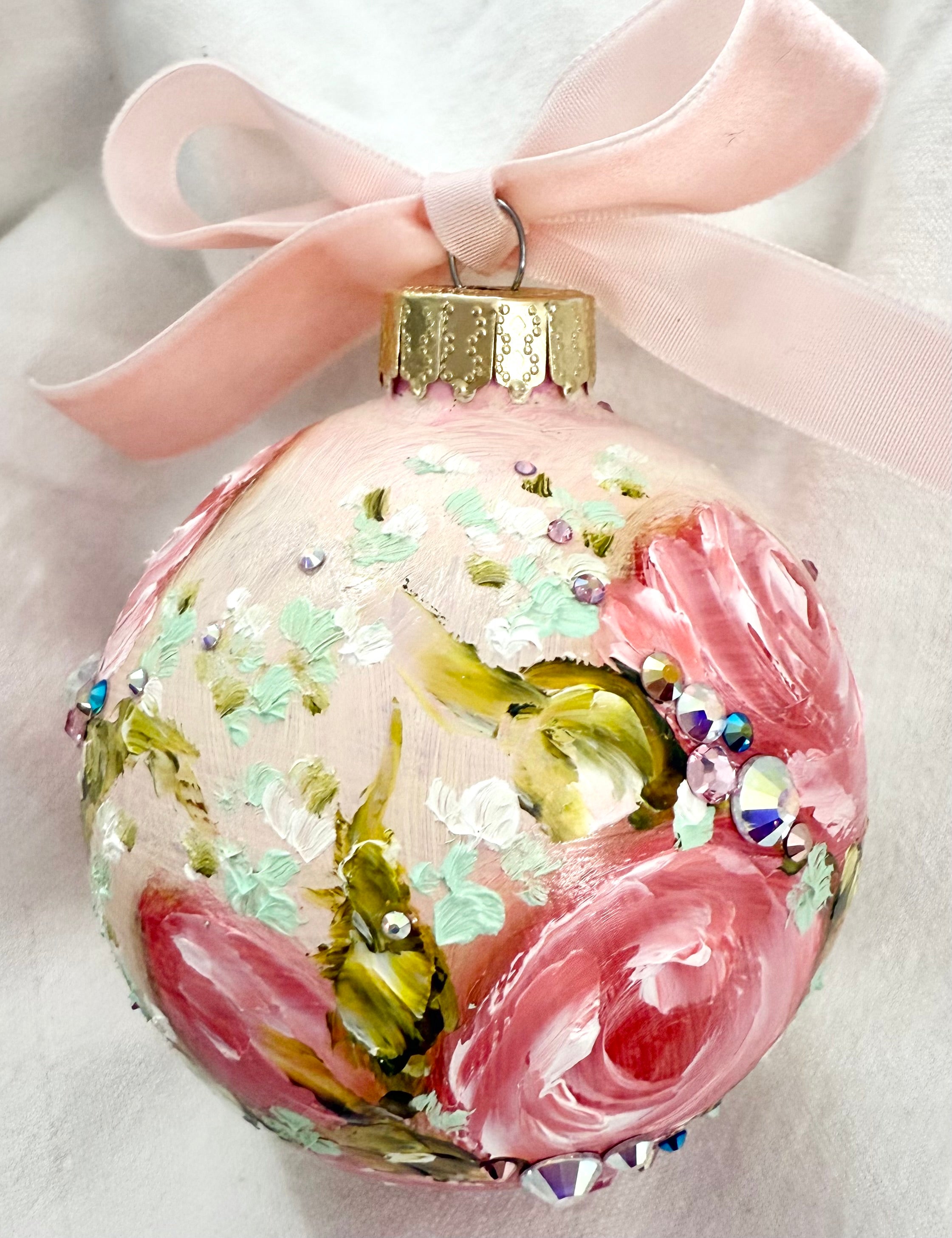 Pale yellow 3" glass ornament covered in pink roses and sparkly crystals. I hand paint all my ornaments using the finest quality oil paints and then I varnish them for protection. For the perfect finishing touch, I add sparkly crystals and my initials. These are so beautiful and make the perfect gift or addition to your Christmas tree.