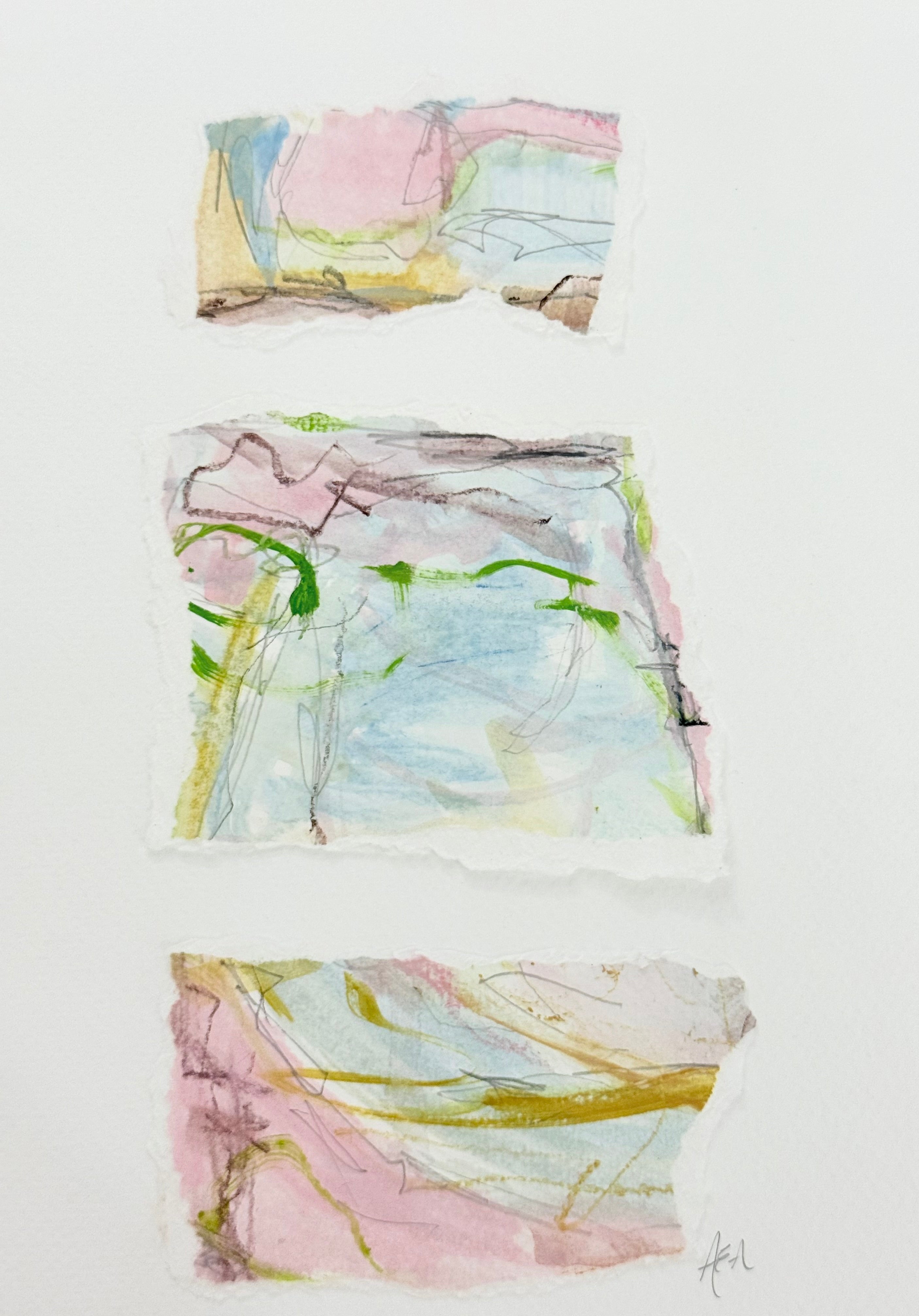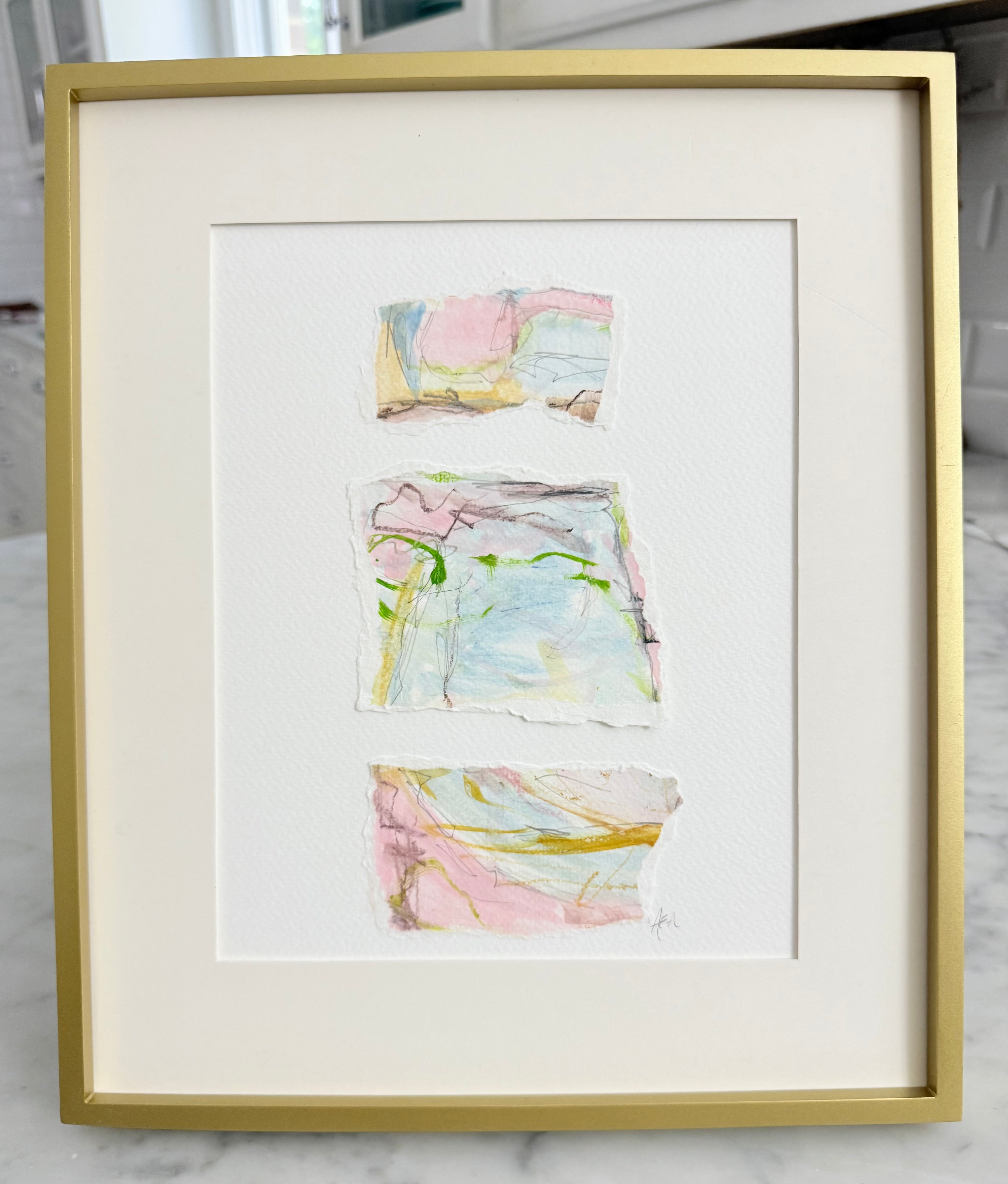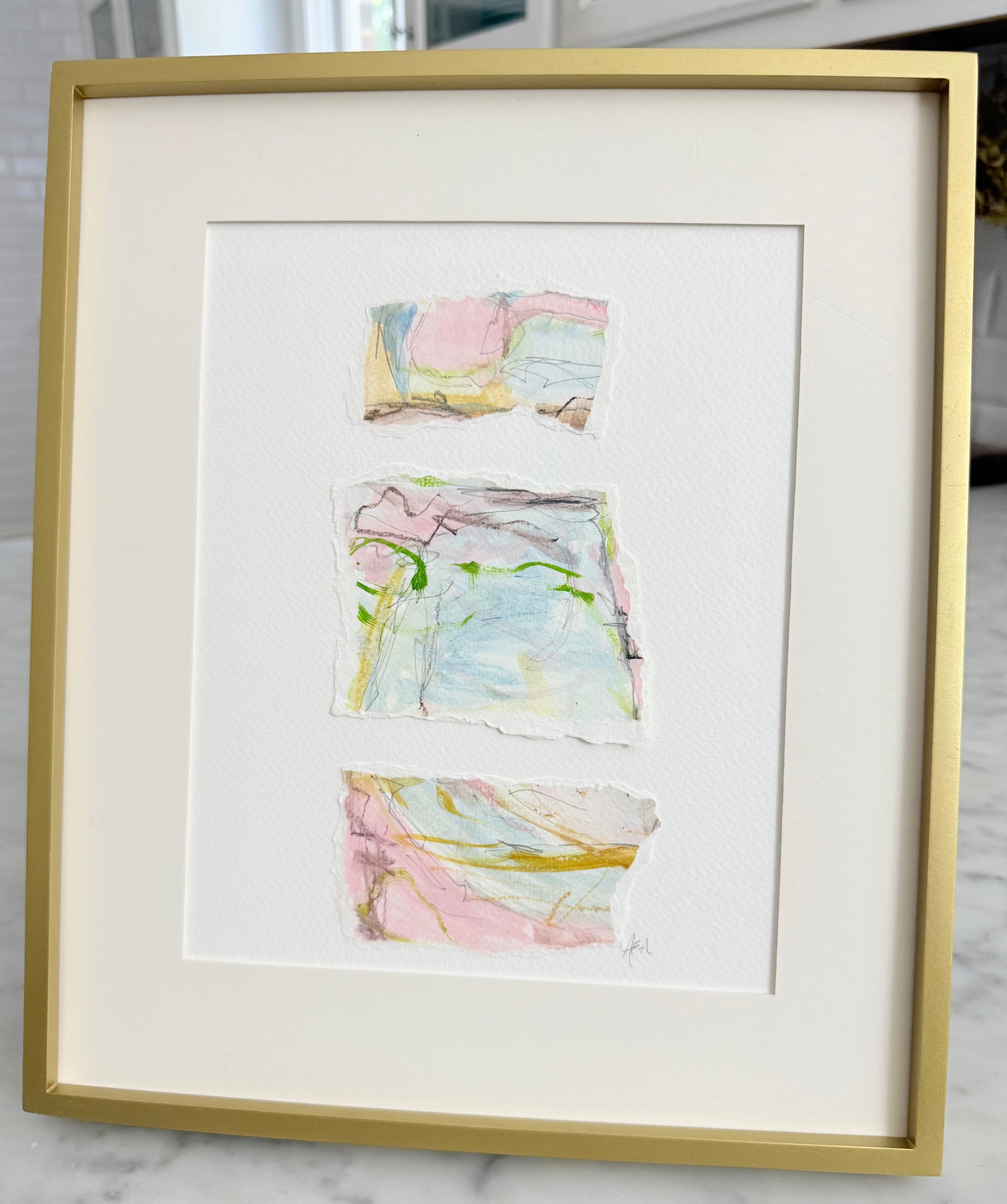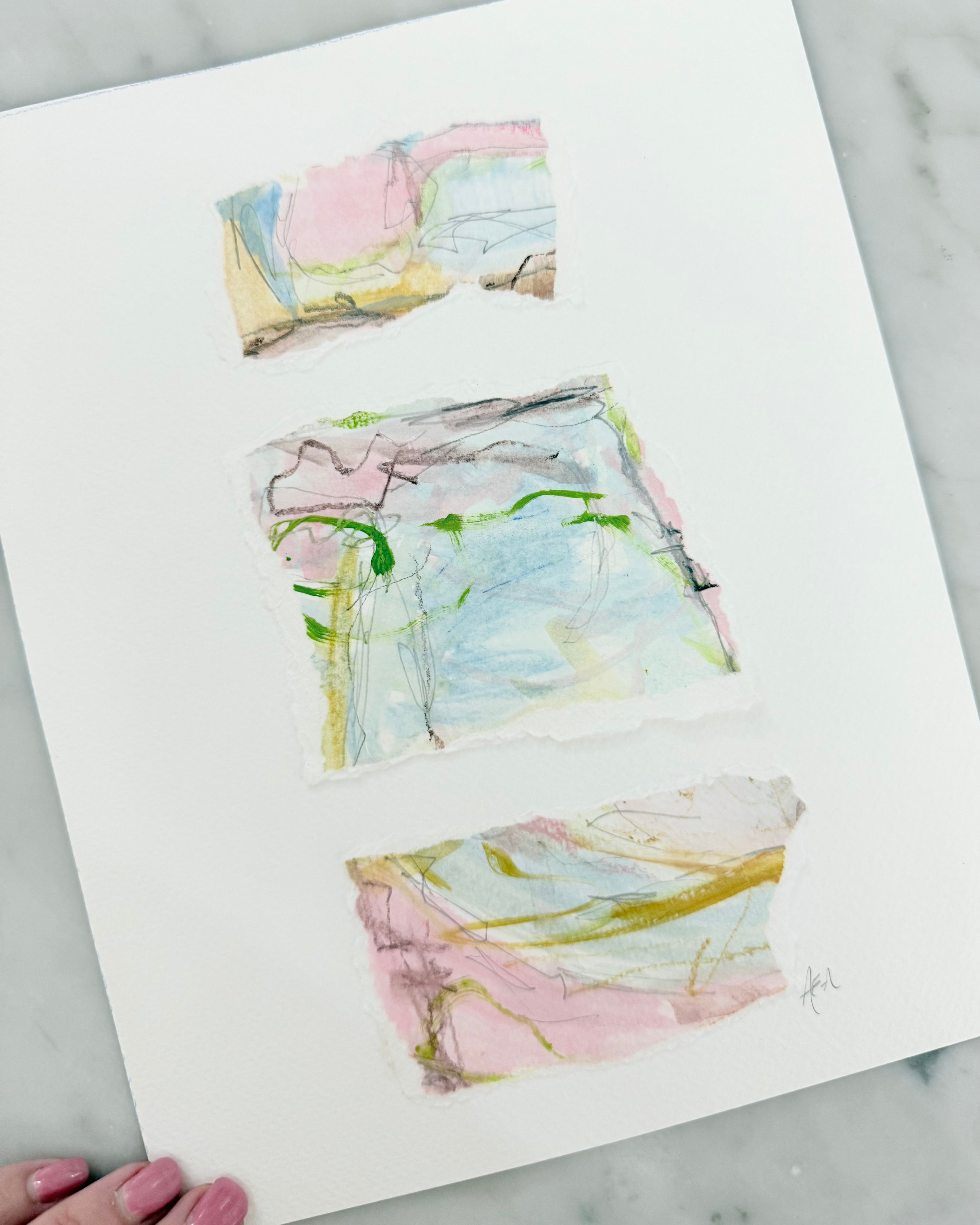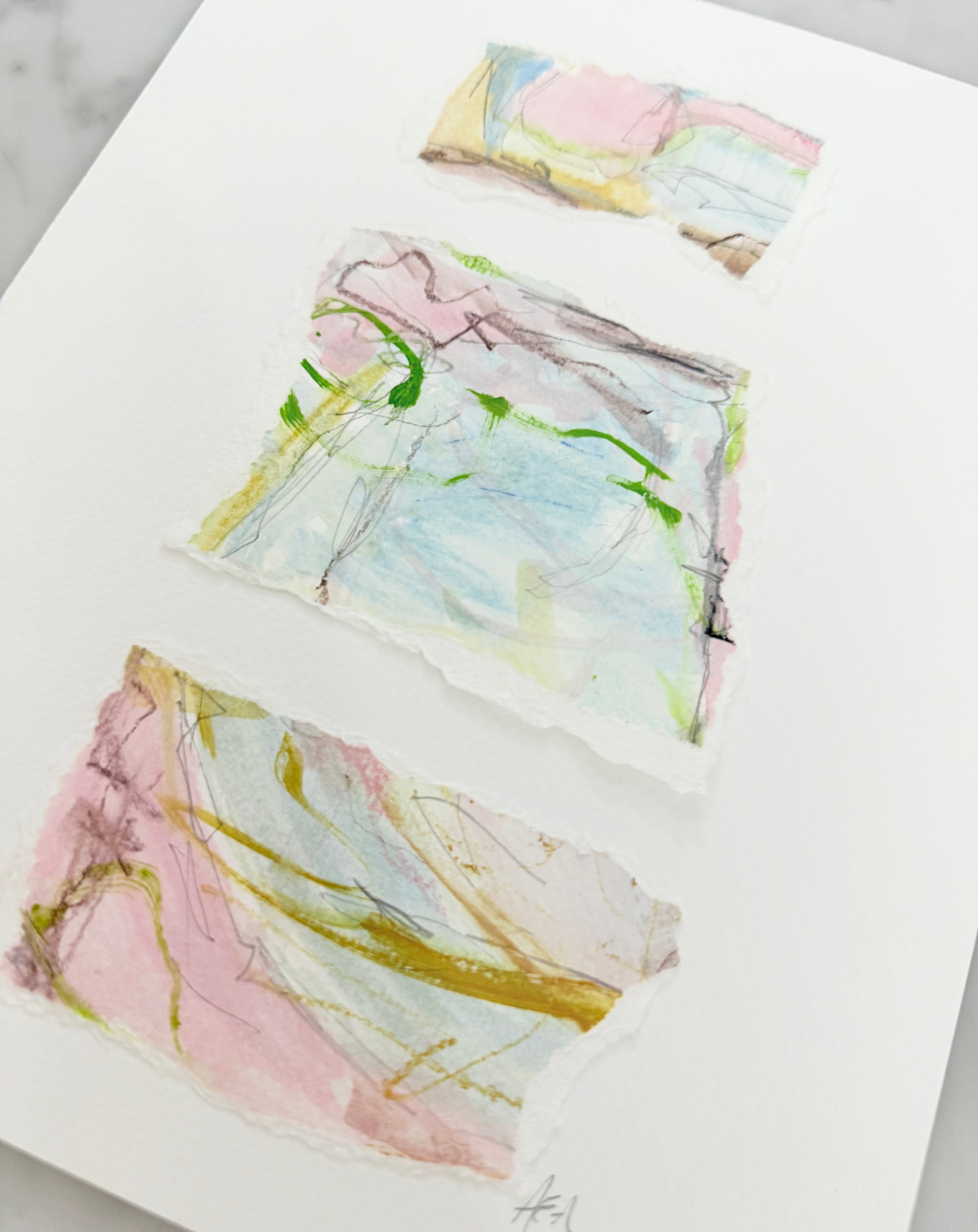 I had the most wonderful time creating these pieces. I started with an abstract watercolor using specific color schemes. Once the painting is finished I tear it into colorful pieces and thoughtfully adhere them to a thick weighted paper. These can be framed so easily and will elevate any room.